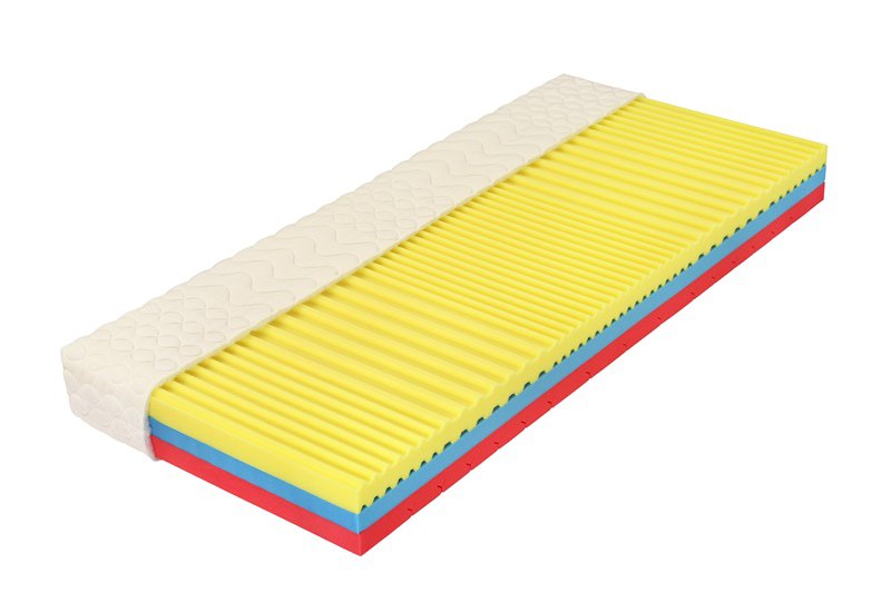 - Střední stabilizační vrstva (modrá) z tuhé pěny vyššího objemu (stabilita a přirozená tuhost lůžka).