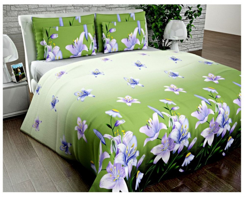 Bavlněné ložní povlečení – Lilie na zelené v 1 balení obsahuje polštář o rozměru 70 × 90 cm a povlak na přikrývku o rozměru 140×200 cm.