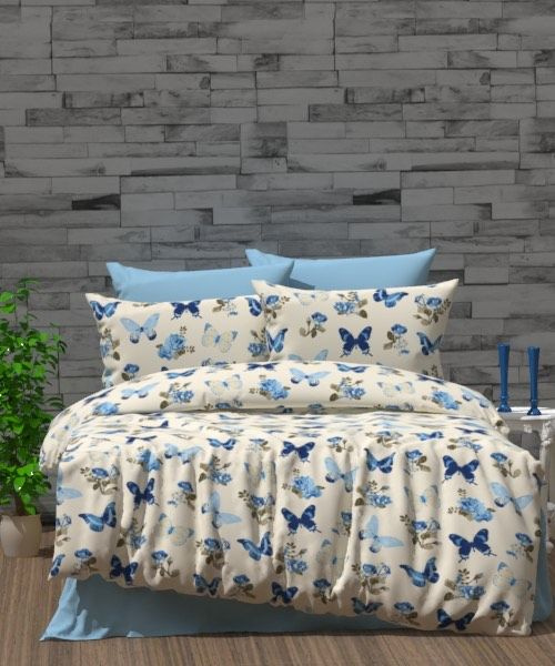 Bavlněné ložní povlečení – Motýl modrý v 1 balení obsahuje polštář o rozměru 70 × 90 cm a povlak na přikrývku o rozměru 140×200 cm.