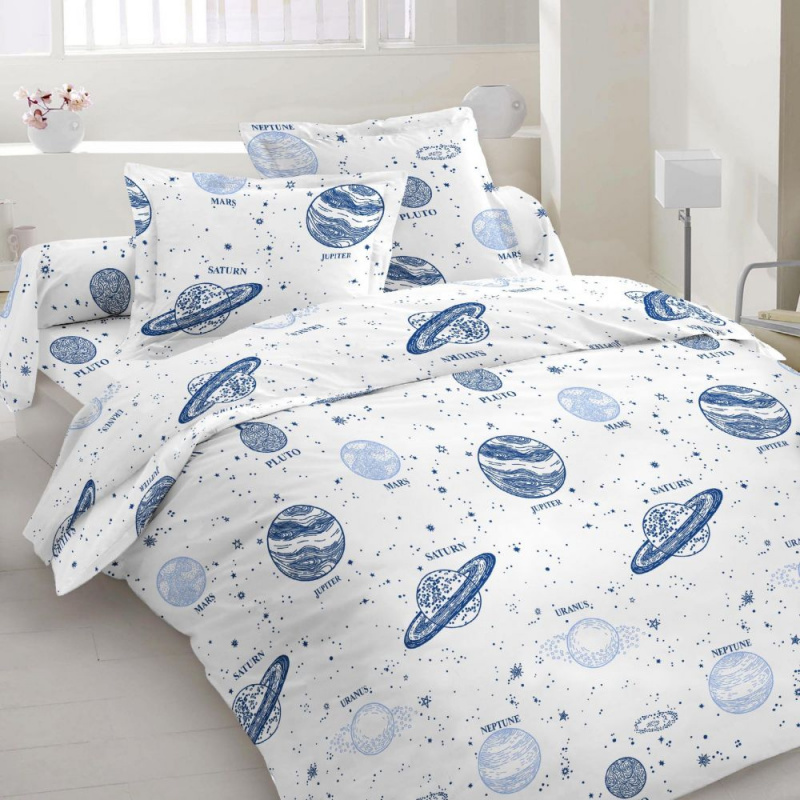 Bavlněné ložní povlečení – Vesmír bílý v 1 balení obsahuje polštář o rozměru 70 × 90 cm a povlak na přikrývku o rozměru 140×200 cm.